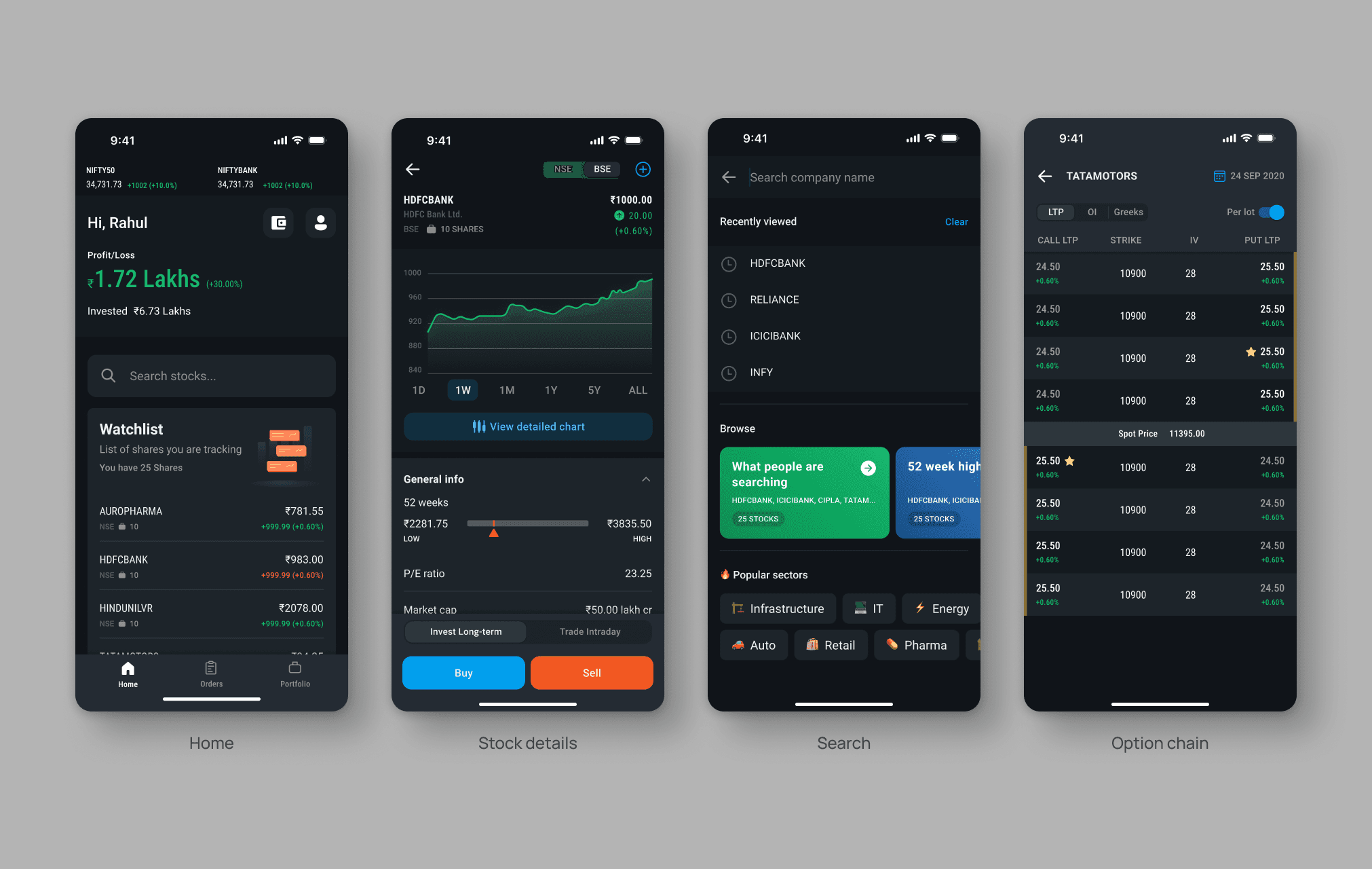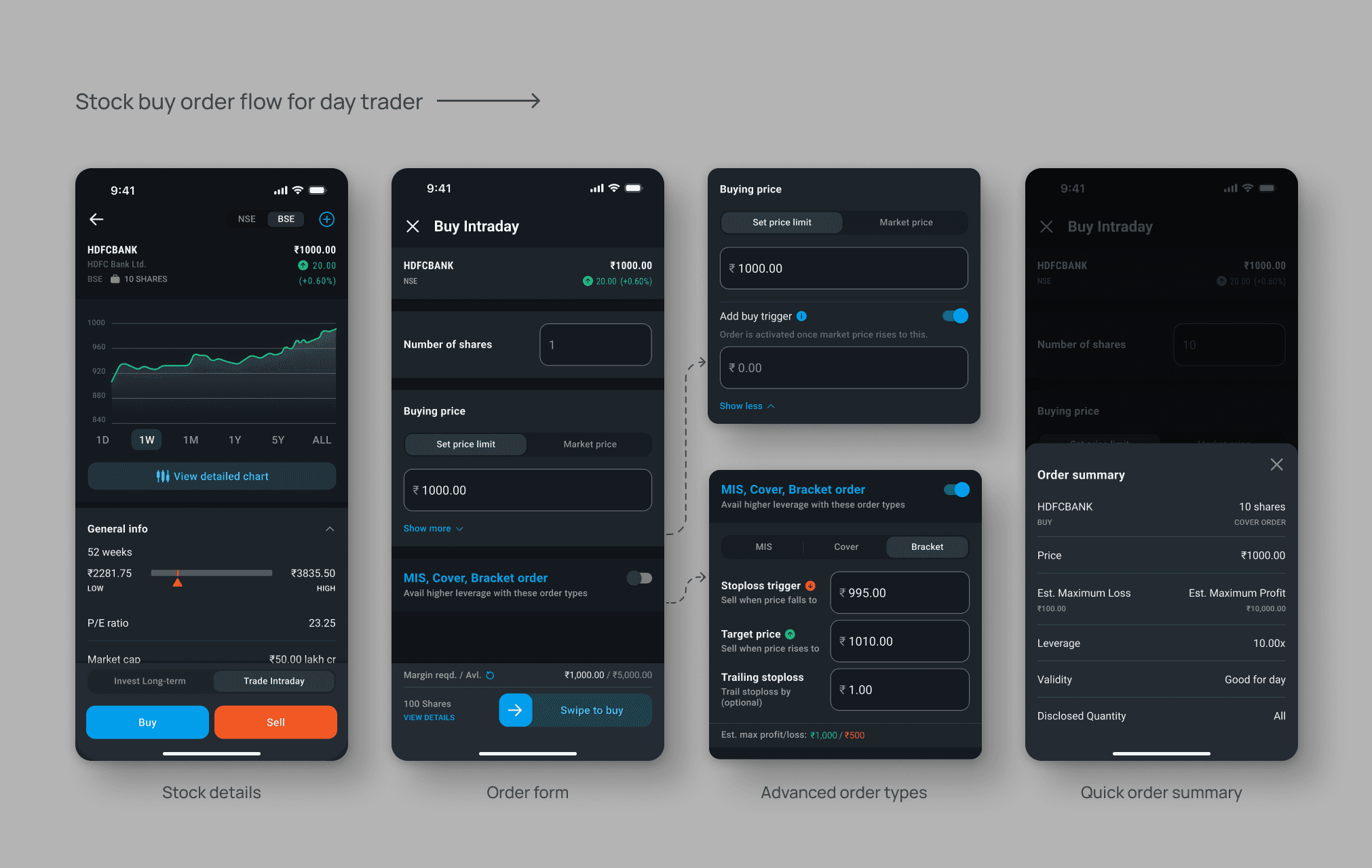 Core screens across the trading journey (discovery, portfolio, post-trade tracking)