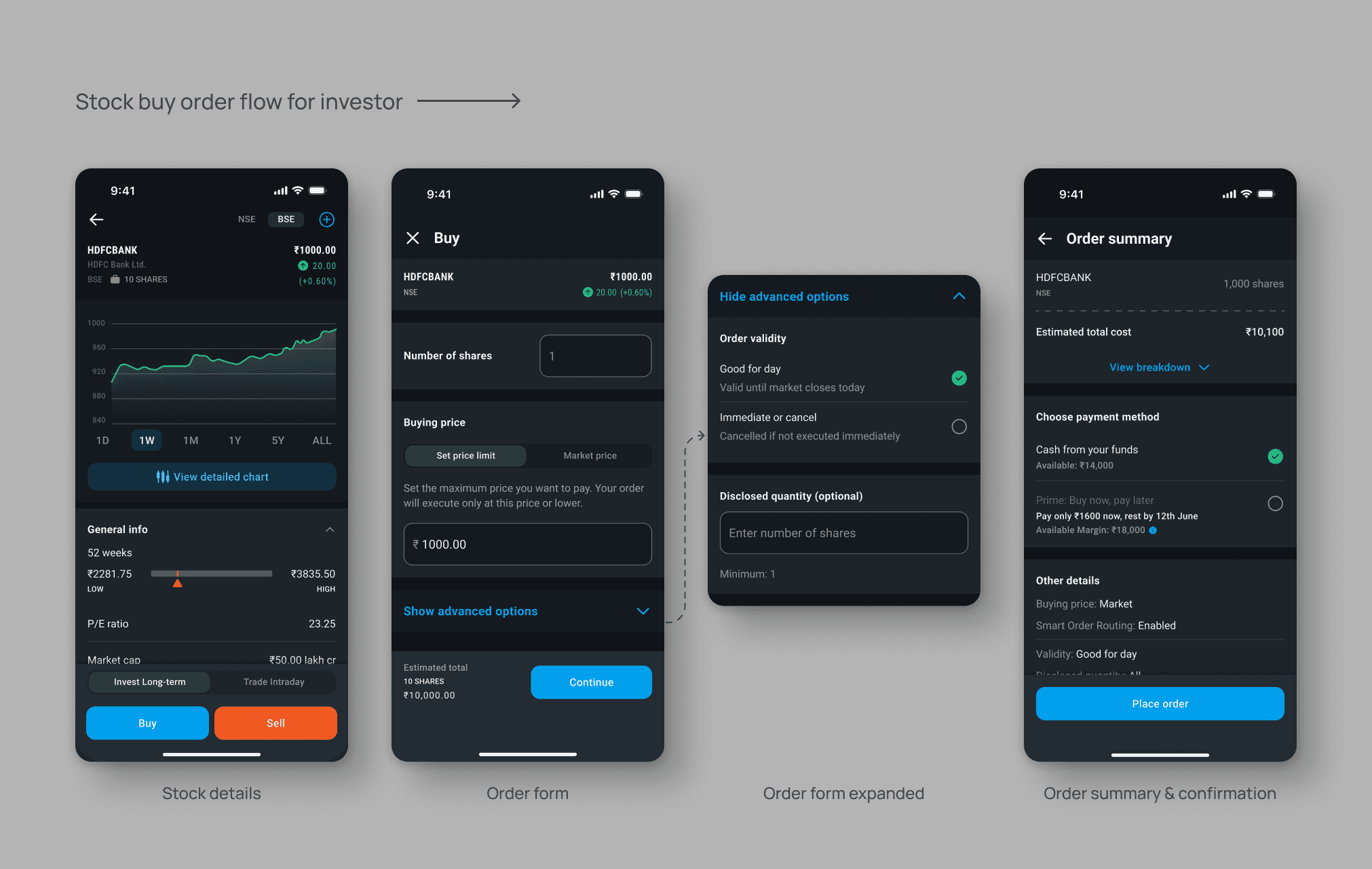 While the order form was my primary focus, I designed screens across the full trading journey — from stock discovery and watchlists to portfolio tracking and post-trade status. This end-to-end involvement ensured a consistent experience and informed the design system architecture.